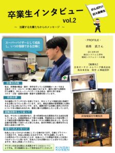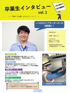 2月の期末試験が終わると、いよいよ本格的に就職活動がスタートします。 4年生・専攻科1年生のみなさんはどんな未来を描いていますか? 本校を卒業し、各方面で活躍する先輩たちの姿をご紹介したいと思います。